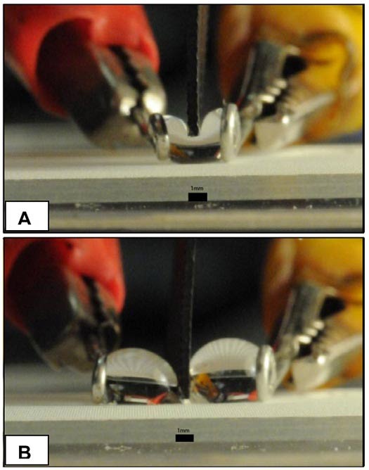 زمانیکه گروه تحقیقاتی چاقو را به قطره آب نزدیک کردند، قطره به دو نیمه شکافته شد که هر کدام به یکی از حلقه سیمها متصل بود (ویدئوی زیر را ببینید). با این وجود، قطرات تا حدودی در مقابل برش مقاومت میکردند و بلند کردن چاقو در میانه برش باعث میشد تا قطرات مجددا به یکدیگر وصل شده و شکل اولیهشان را به خود بگیرند.
