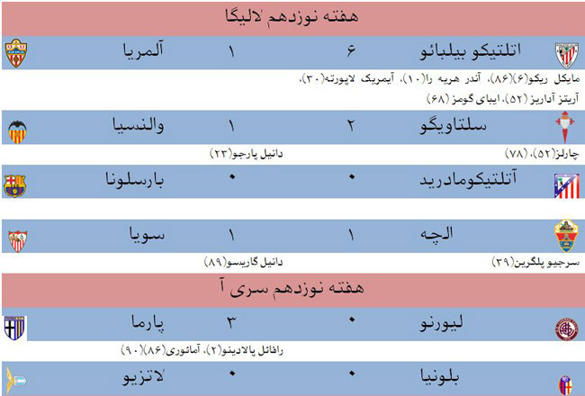 شب گذشته رقابتهای فوتبال در لیگها اروپایی در جریان بود و در هفته نوزدهم لالیگا چهار دیدار و از هفته بیست و یکم لیگ جزیره هفت دیدار و از هفته نوزدهم سری آ ایتالیا دو دیدار برگزار شد.