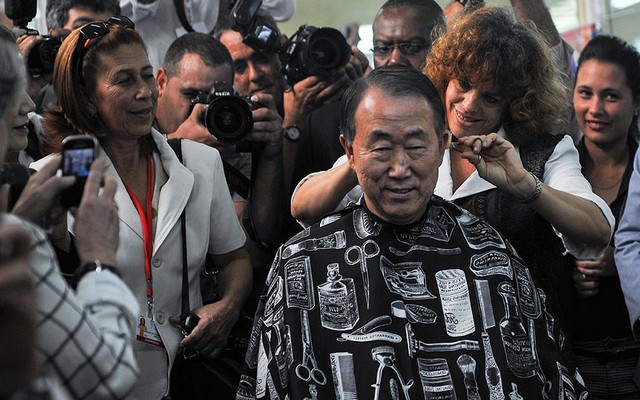 بان کی مون دبیر کل سازمان ملل که برای شرکت در یک اجلاس بین المللی به هاوانا کوبا سفر کرده در یک مغازه سلمانی در بخش قدیمی شهر هاوانا موهایش را اصلاح کرد