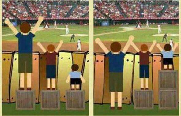 عدالت با برابری فرق می کند با رحم و شفقت هم تناسبی ندارد هر کدام در جایگاه خود داری ارزشهای انسانی است. تصویر سمت راست به عدالت نزدیکتر است چون در ازای پولی که نپرداختند در جایگاه غیر از جایگاه تماشا گران به تماشای بازی نشستند و می توانست همین جایگاه نیز در اختیار انها قرار نگیرد یا جایگاه بهتری در اختیار انها قرار گیرد. این اقدام دیگر نسبی و بستگی به مدیریت حاکم بر آن استادیوم دارد.