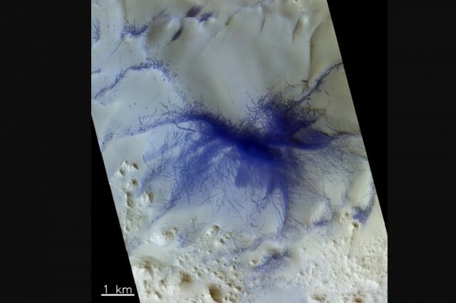 آژانس فضایی اروپا(EA) اخیراً تصاویر باورنکردنی از سطح مریخ شکار کرده است که یک عنکبوت مودار آبی رنگ را بر روی سطح سیاره سرخ نشان میدهد اما واقعاً این رگههای آبی روی مریخ چیست؟