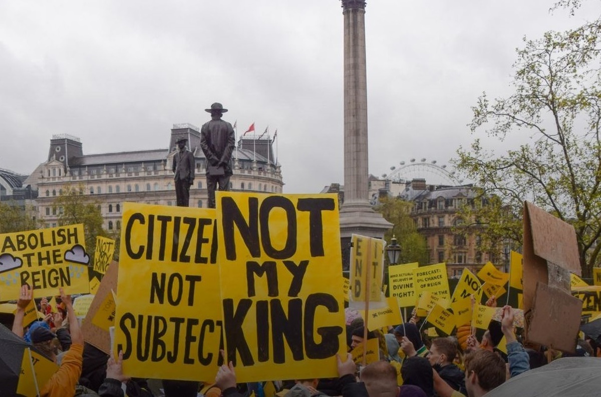 صدها نفر از حامیان جمهوری و مخالفان پادشاهی از صبح زود روز تاجگذاری در میدان ترافالگار لندن تجمع کرده بودند و شعار می دادند.